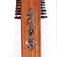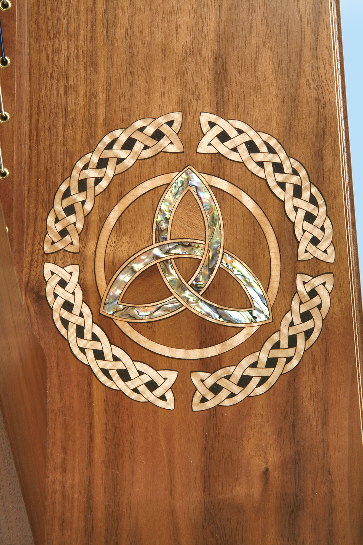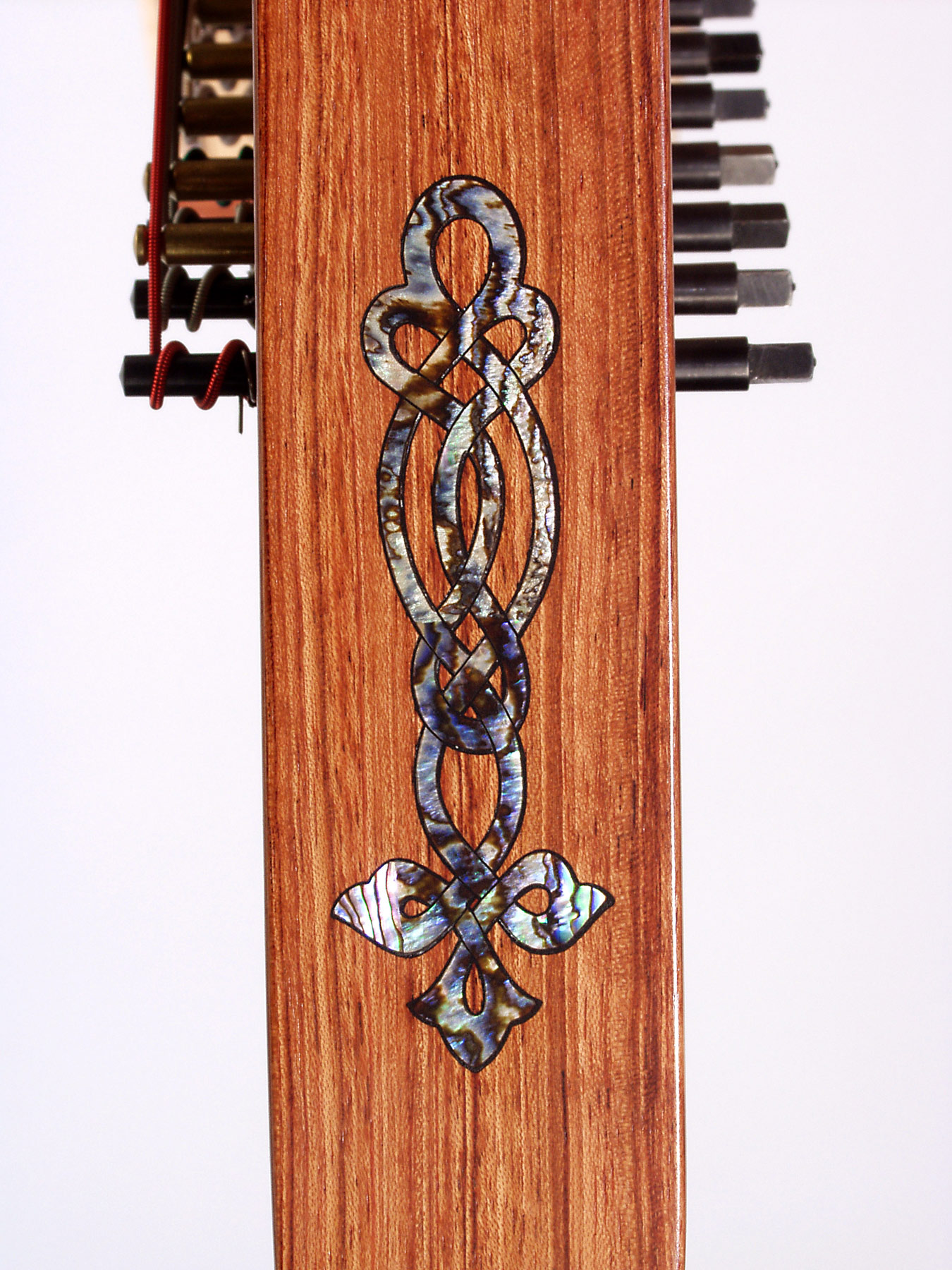 Single abalone binding along the inside of the soundboard. This elegant detail adds to the overall beauty of the harp. This detail can be added to most models except the Christina model. Price $400.00