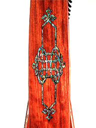 This enhancement can be added to any harp that has a neck cap (Celtic, Catalina and zephyr models). Look to the marquetry section to see this same design inlaid with wood. Price $75.00