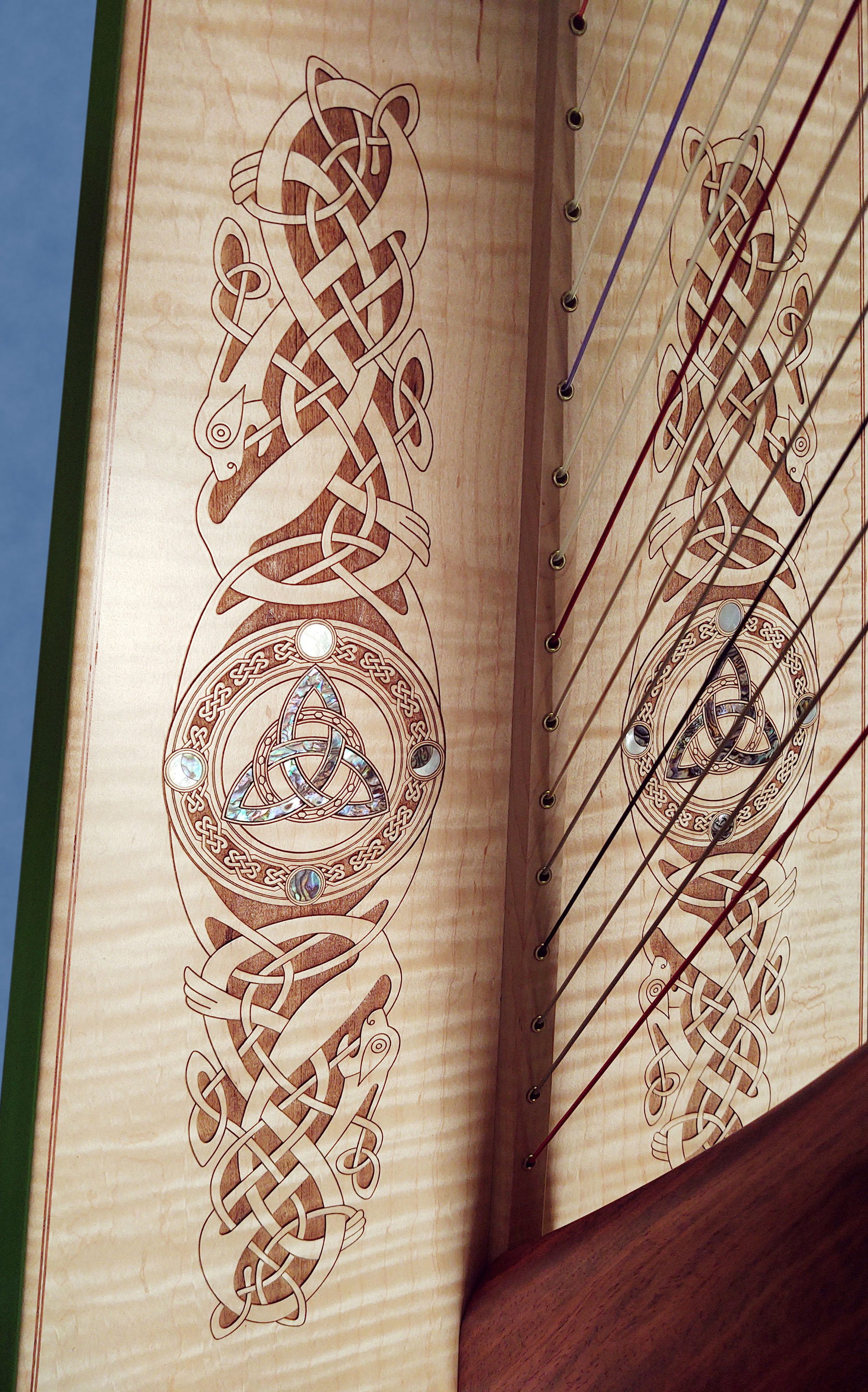 This lovely soundboard engraving with an abalone triangle in the middle and the 4 stages of the moon is a design we put together based on some of our other Celtic designs. It turned out so elegant we are now offering this beautiful enhancement on any of our harps. We are using abalone and mother of pearl for the stages of the moon. Price $500.0