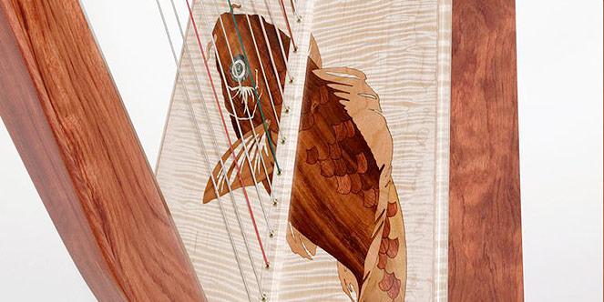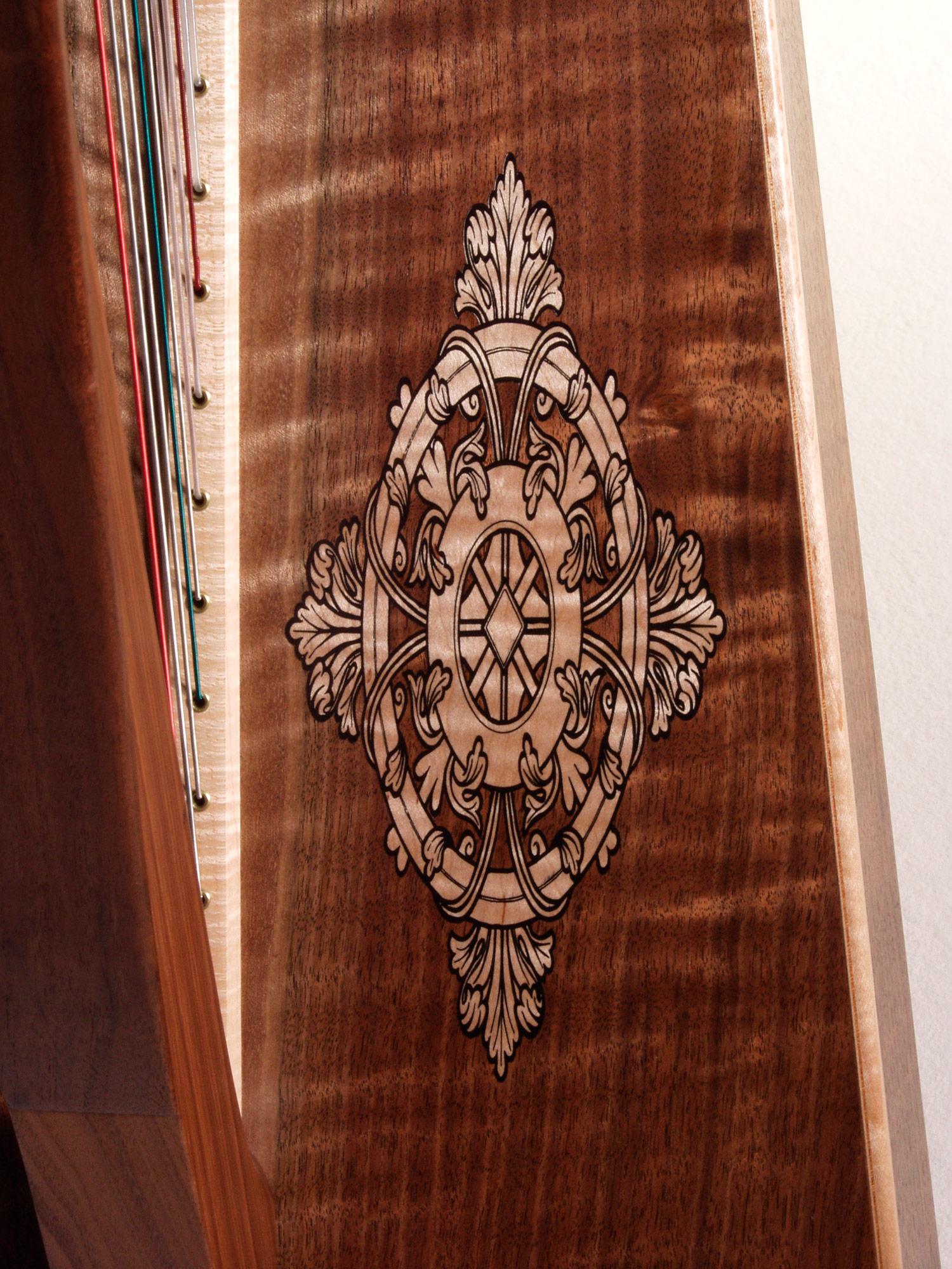 This intricate design adds a touch of yesteryear to your harps overall look. We use a contrasting wood colour than the fore pillar and then add detail with black onyx which makes it look like pen and ink. This design motif will work on any harp with a fore pillar. Price $300.00