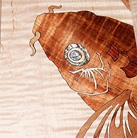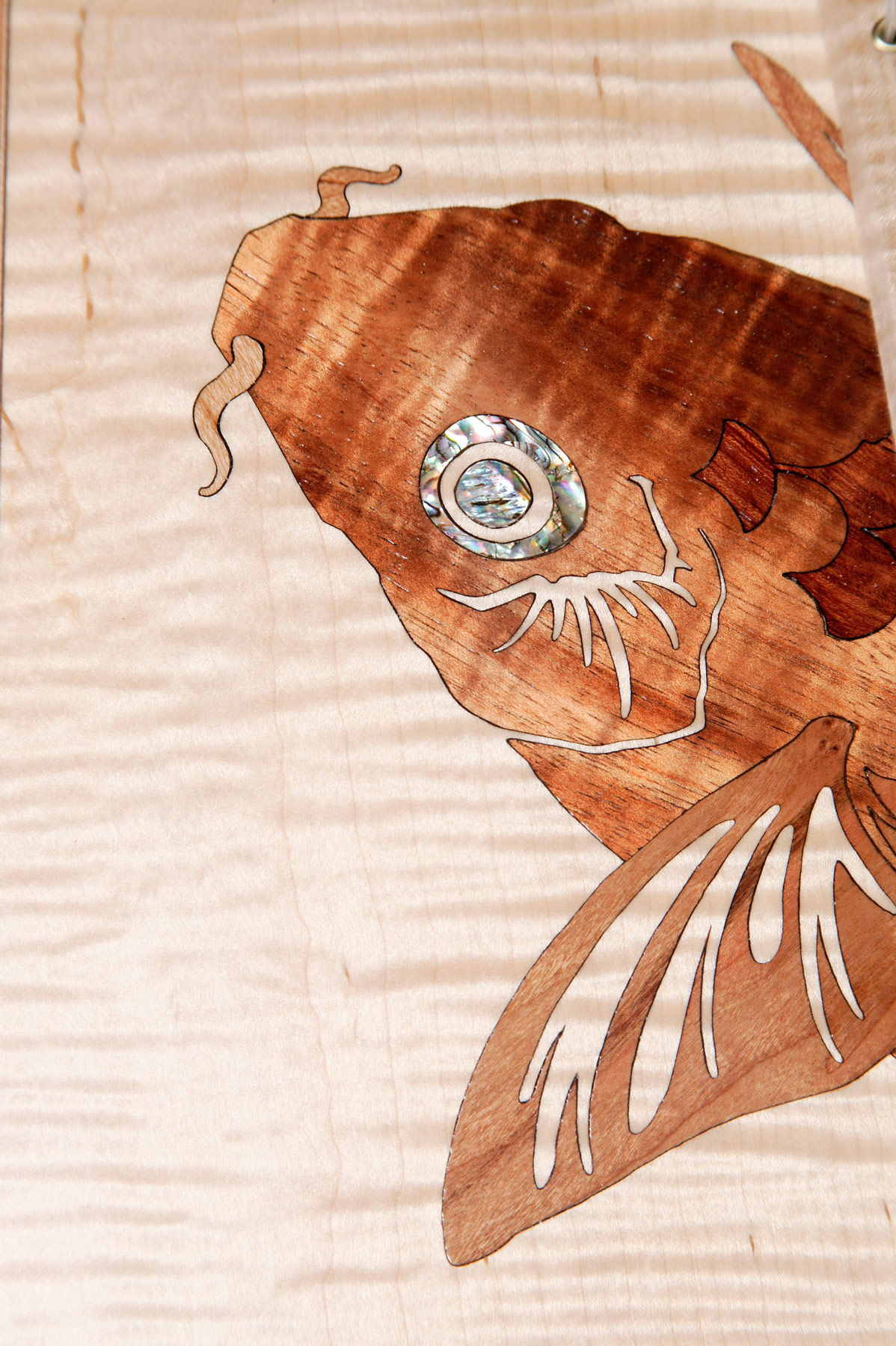 The artistry and precision of the marquetry Koi fish will amaze the most discriminating buyer. The woods used for the inlay are picked according to the wood type of the instrument and we add a touch of abalone for the detail in the eyes. $600.00 for 2 fish