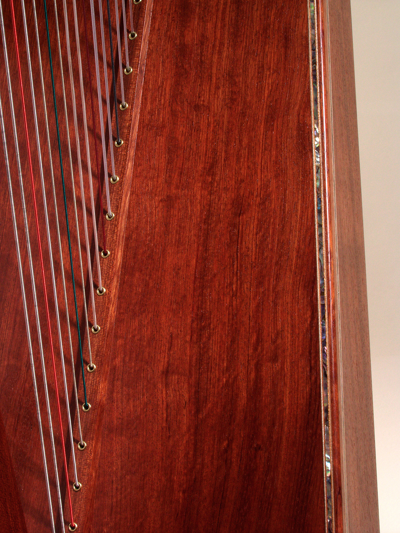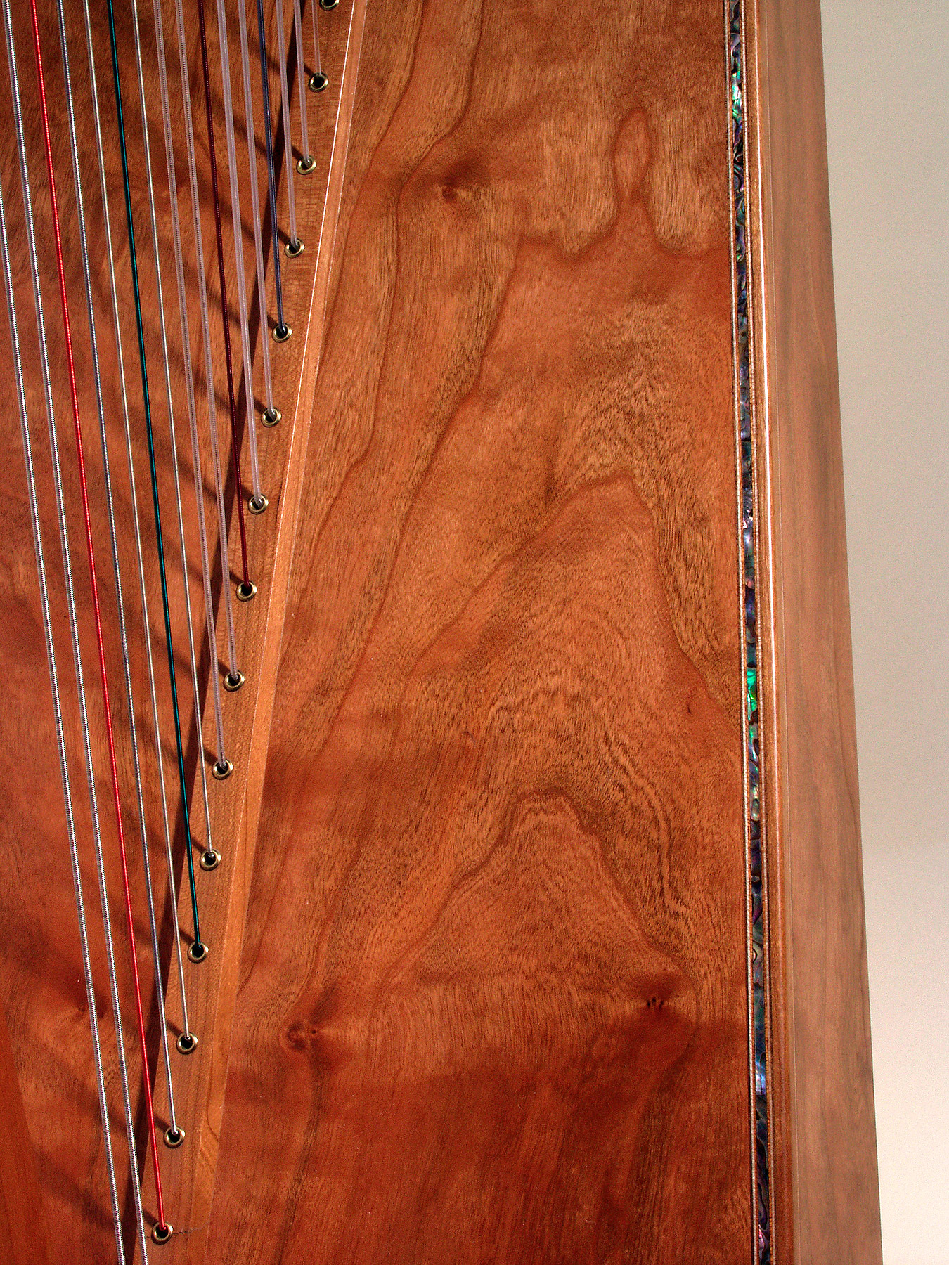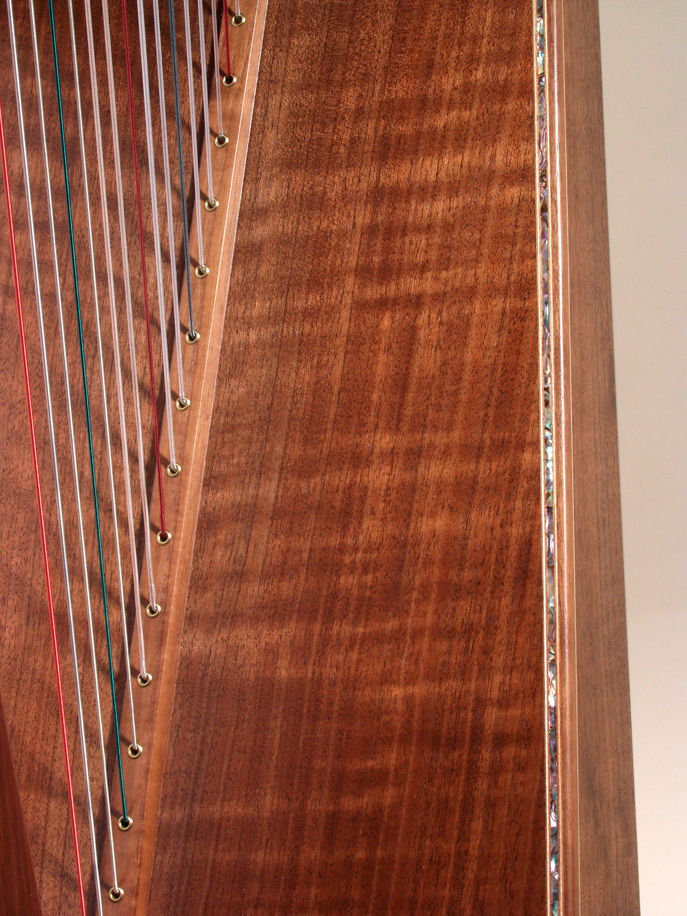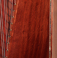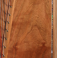 No matter what the inside of the soundboard is made out of, each harp has a hardwood veneer that we hand cut. When we cut the boards to make your harp, we use the best wood we can find and use this same wood for your soundboard veneer so it will match completely, all around the harp.