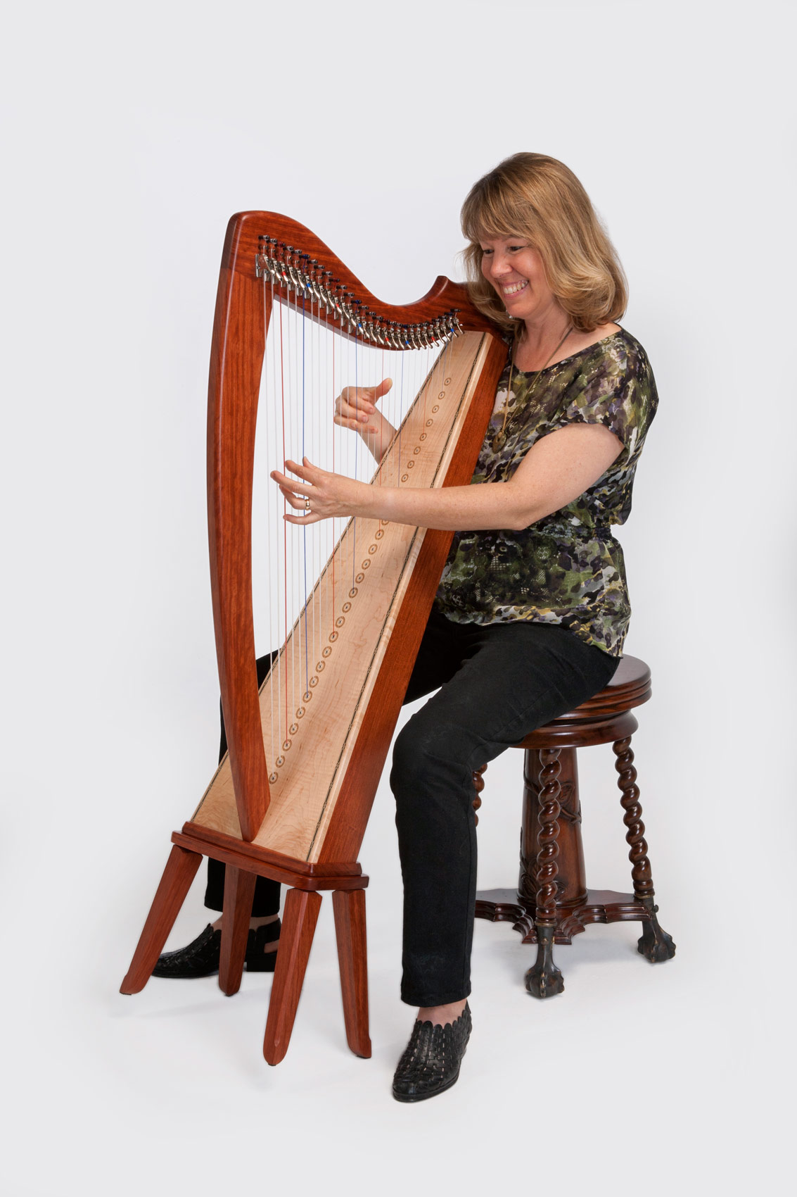 T he Shanti 28 string is a harp we decided to build because of the success of the Christina Therapy Harp. The Christina has a light, delicate sound which is perfect for therapy work; however some people want a more voluminous harp. The Shanti, meaning peace, is truly a peaceful and exquisite looking and sounding harp. With a full sound and excellent range, it is extremely versatile. This harp can be played using its beautiful, handcrafted bench or by putting the harp on the floor or table. Both children and adults will love this peaceful, medium-tensioned harp.