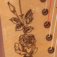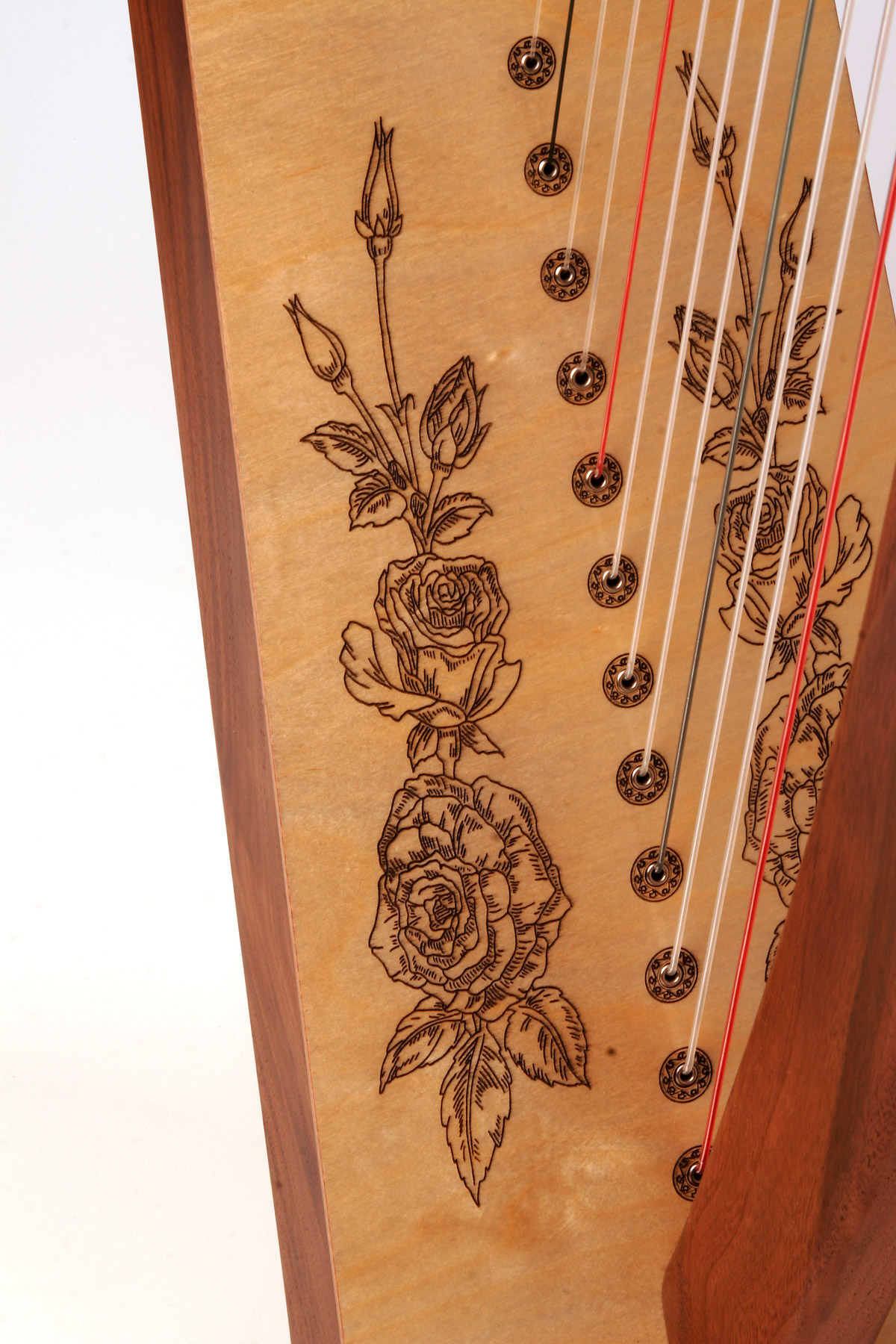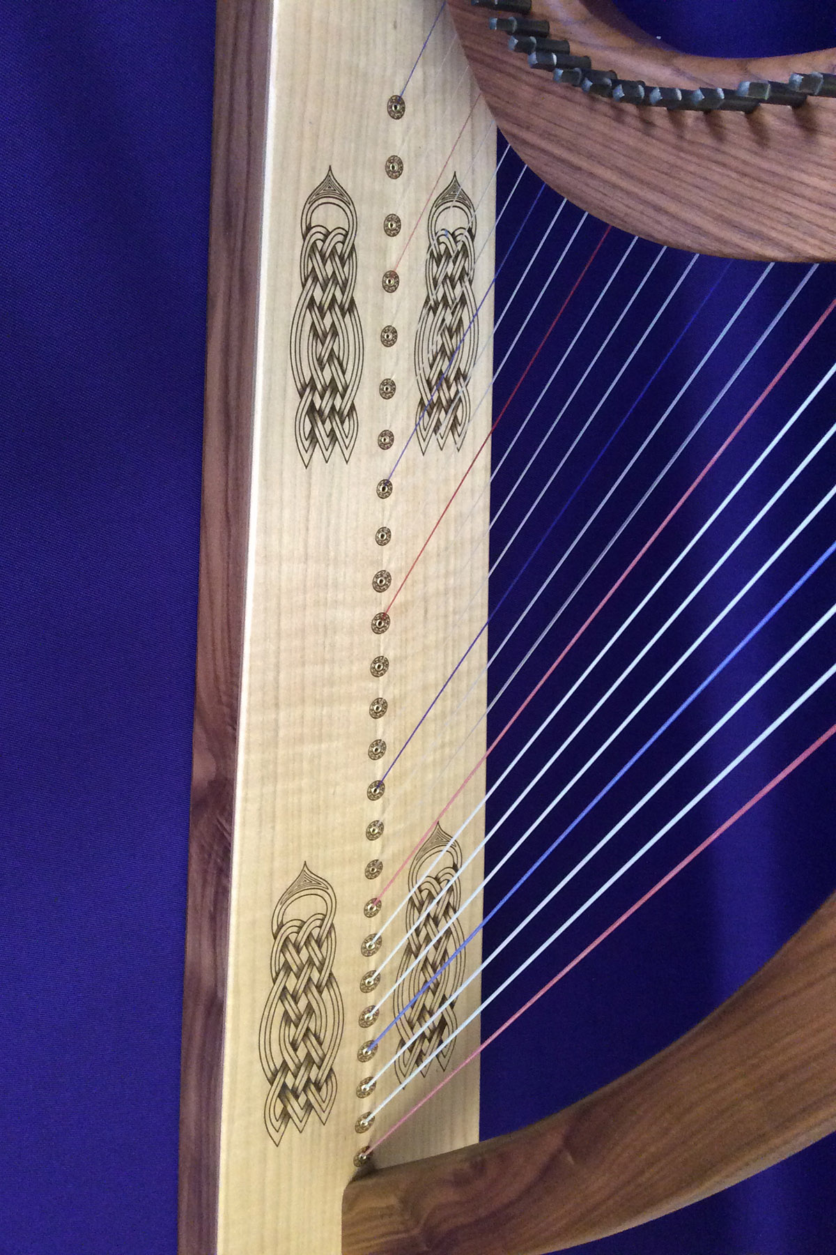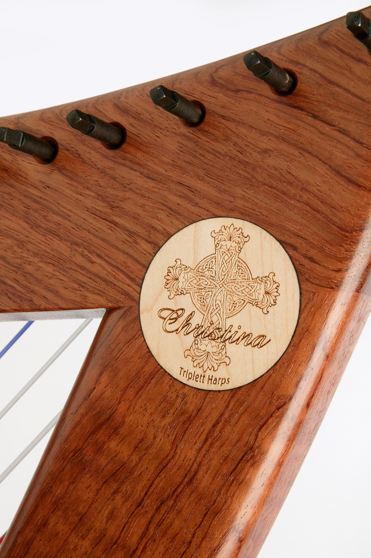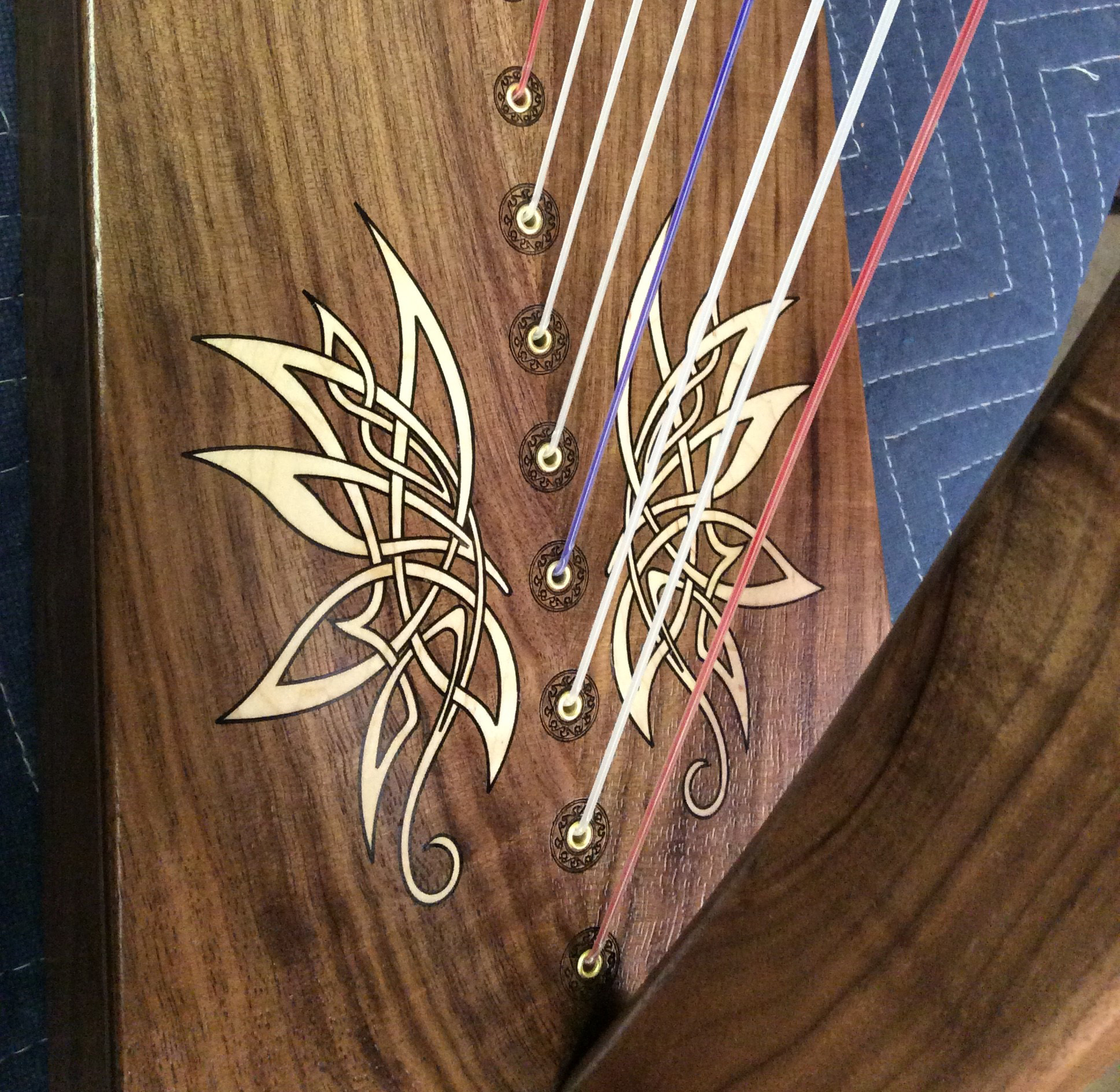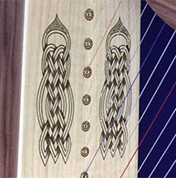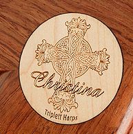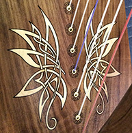 This lovely Celtic butterfly is shown in maple on a walnut Christina soundboard. A delicate design that would enhance any of our harps. Price $275