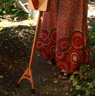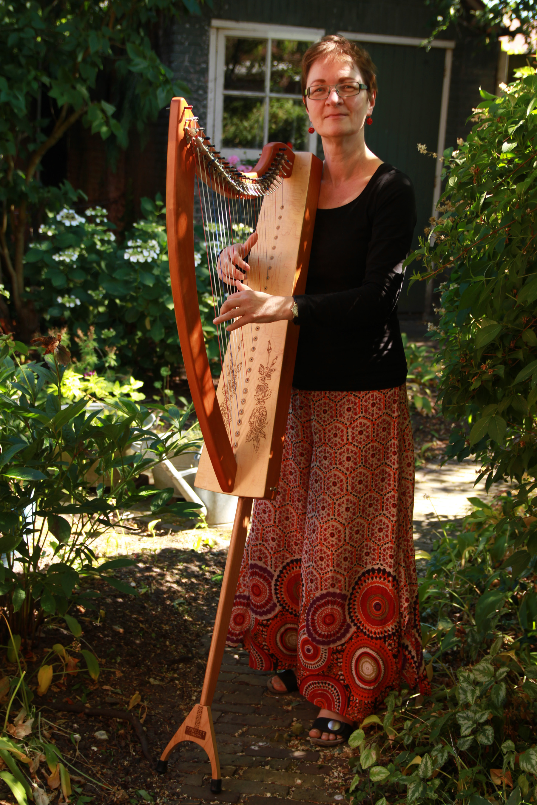 This full size standing bar is modeled by Helga who is 5'7". It comes in all wood types and is perfect for the person who wants to stand and play but doesn't want to wear the harp around their body. Standing bars made with Cherry, Maple, Walnut or Sapele cost $275 while those made with Bubinga Wood are $300.